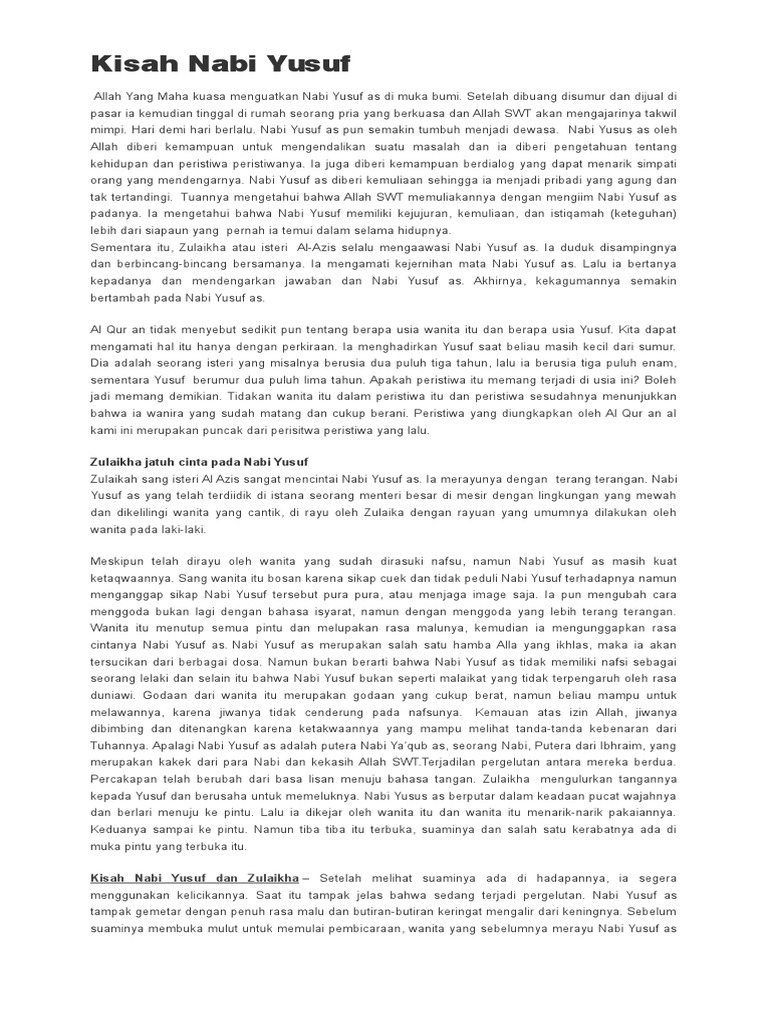 Akan tetapi dalam kisahnya banyak sekali pelajaran pada mulanya, zulaikha merawat nabi yusuf dengan harapan semoga anak ini berguna dan memberi manfaat. Doa nabi yusuf ini dibaca ketika nabi yusuf menghadapi sebuah ujian yaitu tatkala beliau digoda oleh istri orang yang mengasuhnya. Daftar isi yusuf dikeluarkan dari sumur dan dibawa ke mesir kisah nabi yusuf dan zulaikha Ali mursyid dan zidna khaira amalia. Setelah melakukan transaksi dengan membeli anak muda tersebut, selanjutnya futifhar pulang kerumah, membawa budaknya tersebut. Home/edukasi/kisah 25 nabi dan rasul/kisah nabi yusuf 'alaihissalam. Nabi ya'qub memiliki 12 anak dan salah satu yang menjadi nabi dan rasul sebagai generasi penerusnya adalah yusuf. Dalam riwayat shahih dan alquran hanya diceritakan jelas tentang zulaikha yang mengganggu yusuf, yusuf masuk penjara. Dalam kisahnya, akhirnya nabi yusuf bertemu kembali dengan seorang perempuan yang hampir mengajaknya untuk bermaksiat. Nabi yusuf justru diangkat sebagai anak. Ia bertemu dengan zulaikha yang masih terus mencintainya, kemudian ia pun menikahinya, di hari jumat. Terima kasih tuan pengerusi majlis, barisan wahai yusuf, lupakanlah hal ini. Termaktub dalam alqur'an surat yusuf.