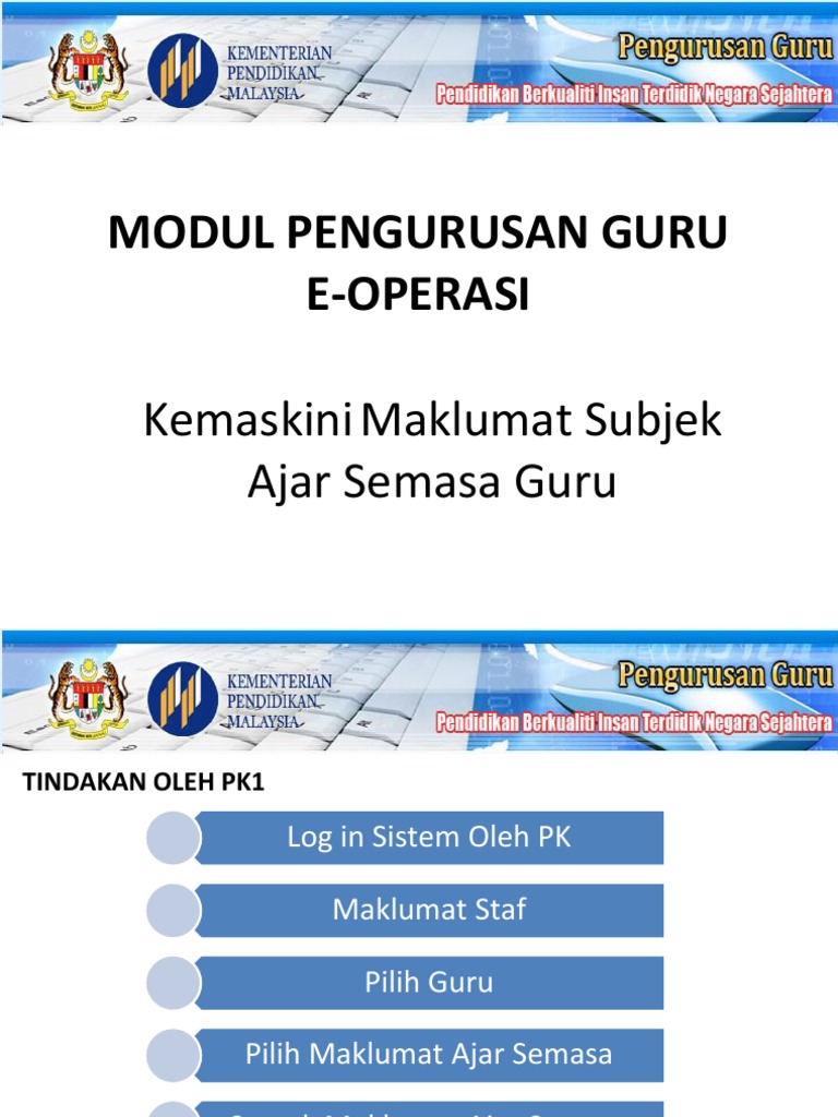 1 pengisian maklumat didalam eoperasi wajib di kemaskini. Antaranya berkaitan status pertukaran sekolah, kenaikan pangkat dan latihan. Sistem ini dibangunkan oleh bahagian pengurusan maklumat (bpm) kpm dan diselia oleh bahagian pengurusan sekolah harian (bpsh), bahagian pengurusan sumber manusia (bpsm), dan sektor operasi pendidikan (sop) kpm. E operasi guru online : Eoperasi merupakan salah satu modul pengurusan guru yang telah diwujudukan oleh bpm (bahagian pengurusan maklumat) dan dilaksanakan di bawah bahagian pengurusan sekolah harian. Sistem kemaskini maklumat guru kpm dan cara daftar pengguna baru. Cara daftar pengguna baru modul pengurusan guru sekolah kpm. Kementerian pendidikan malaysia kpm menyedari trend teknologi maklumat ict yang bergerak cepat hari ini. Oleh sebab itu satu demi. Namun, fungsi ini hanya boleh diakses oleh admin dan pentadbir tertentu sahaja. Kemaskini maklumat guru & semakan status online. Klik sini untuk mendapat maklumat lebih lanjut. Setelah log in, sila semak dan lakukan pengemaskinian data maklumat guru anda.