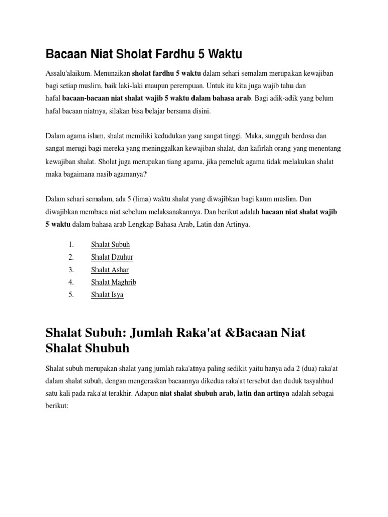 Dalam islam ada banyak ancaman bagi orang yang meninggalkan kewajiban shalat lima waktu, sebagian ulama menganggap orang yang meninggalkan di indonesia kita sering diajarkan untuk membaca niat shalat lima (5) waktu sebelum melakukan takbiratul ihram, gunanya dikatakan agar. Mulai hari ini kuatkan niat mu kebaitullah dan wujudkan bersama umroh.com! Niat sholat bisa dilakukan di dalam hati atau dilafalkan perhatikan dan praktekkan bacaan sholat wajib dan tata cara niat sholat wajib 5 waktu paling lengkap di atas. Sholat sunah rawatib dalam sehari semalam total terdiri dari 22 rakaat, yang terbagi ke dalam lima waktu sholat fardu. Semua bacaan dipermudah ejaan rumi, termasuk doa selepas tarawih.