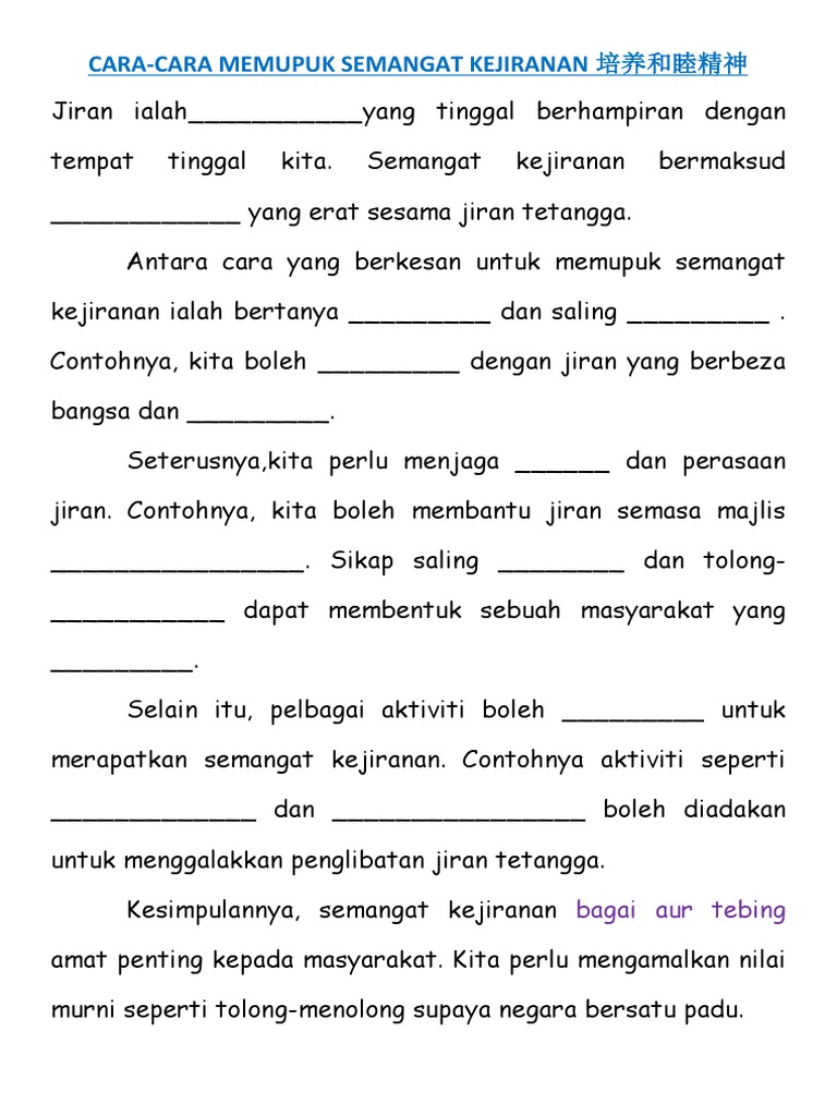 Related : Langkah-Langkah Memupuk Semangat Kejiranan / Contoh Karangan : Kerajaan telah melancarkan slogan 'jiran sepakat membawa berkat' untuk mengembalikan semangat kejiranan yang kian luntur dalam kalangan masyarakat di negara ini..