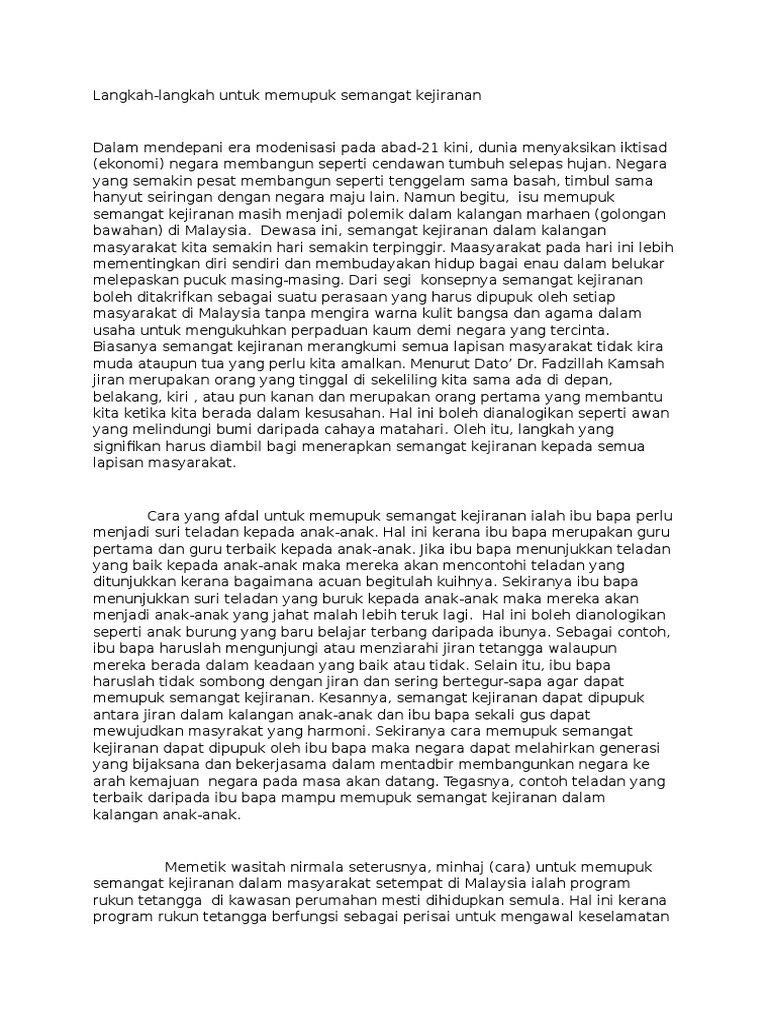 Karangan spm dalam mendapani arus globalisasi dan kemajuan, negara kita kian laju memacu mengejar kemajuan demi kemajuan. Ini akan mengeratkan hubungan kejiranan kerana kita saling mengambil berat antara satu sama lain. For more information and source, see on this link : About press copyright contact us creators advertise developers terms privacy policy & safety how youtube works test new features press copyright contact us creators. Media massa juga memainkan peranan yang sangat penting dalam mengorak langkah memupuk kembali semangat kejiranan yang kian pudar dalam kalangan masyarakat. Langkah langkah memupuk semangat kejiranan dlm kalangan masyarakat. Kini, kita boleh berbangga dengan kejayaan yang dikecapi serta boleh dianggap setanding dengan negara lain bak kata pepatah duduk sama rendah, berdiri sama tinggi. Pihak media massa seperti media cetak, media elektronik dan laman sosial dapat menyebarkan maklumat mengenai semangat kejiranan. Oleh itu, beberapa langkah yang pragmatik harus diambil bagi memupuk semangat kejiranan kepada semua lapisan masyarakat. Cara cara memupuk semangat kejiranan. Tulis rencana anda itu selengkapnya. Karangan bahasa melayu spm kertas 1 bahagian a usaha usaha memupuk semangat kejiranan dalam kalangan masyarakat di malaysia karangan bahasa melayu spm. Cara cara memupuk semangat kejiranan cute766.